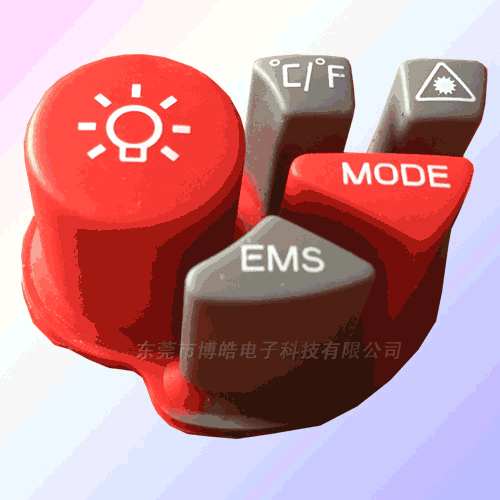 以下這款硅膠按鍵,就是用于通用機(jī)械的,它用兩種硅膠顏色混合成型,便于區(qū)分各按鍵功能,硅膠顏色可以根據(jù)需求調(diào)配顏色,按鍵底部的小圓圈是導(dǎo)電黑粒。